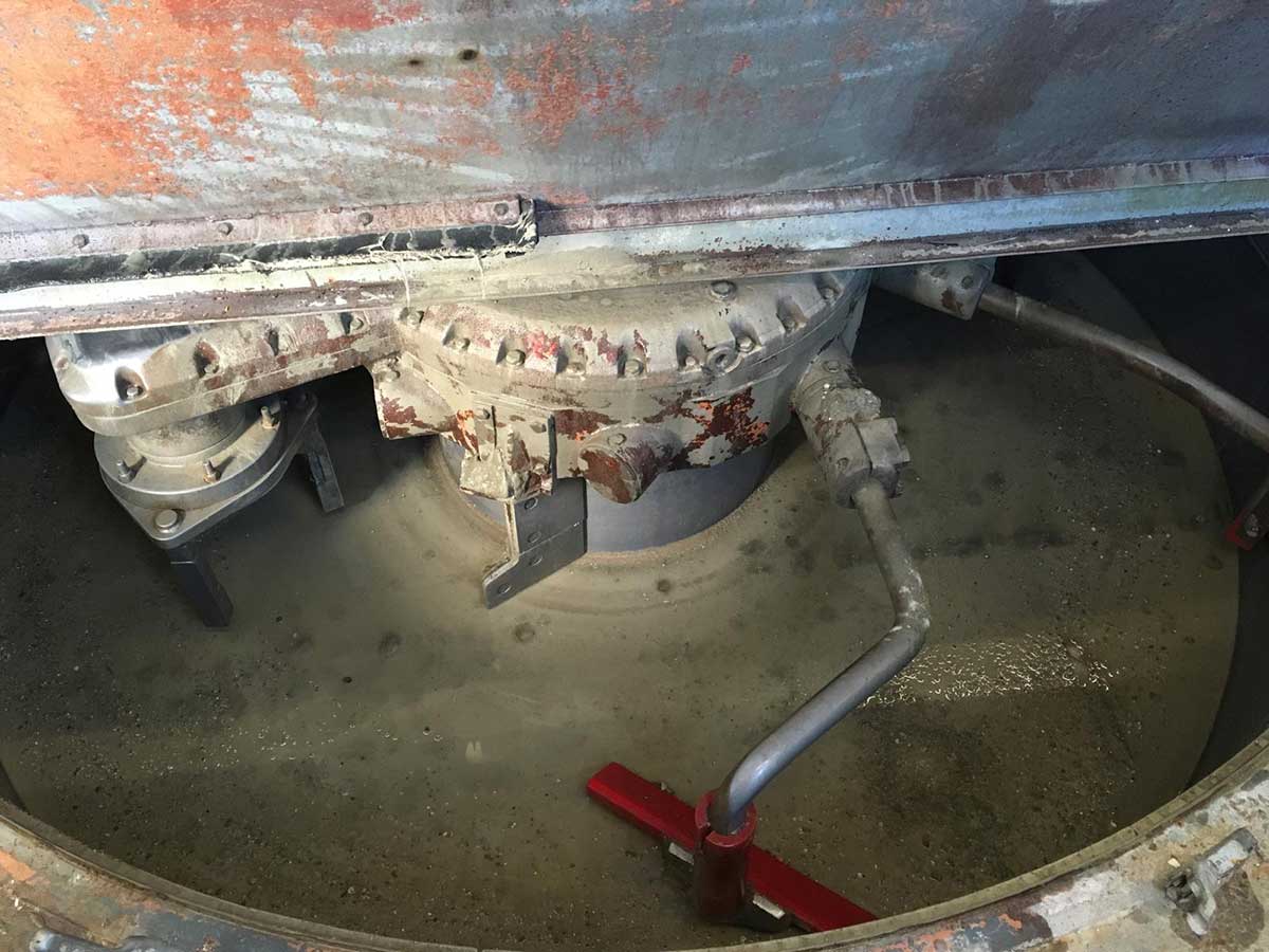 Beim Tellermischer unserer Betonanlage war die Oberschale der Wirblergetriebe so stark verschlissen, dass sie voriges Jahr mehrere Löcher aufwiesen. Über diese Getriebe läuft beim Dosieren in den Mischer ständig das komplette Material (Sand, Kies, Zement), sodass Verschleiß nicht zu vermeiden ist. Unsere Werkstatt hat dann eine Art Haube aufgeschweißt, welche nach einem Jahr ebenfalls schon sehr dünnwandig war.