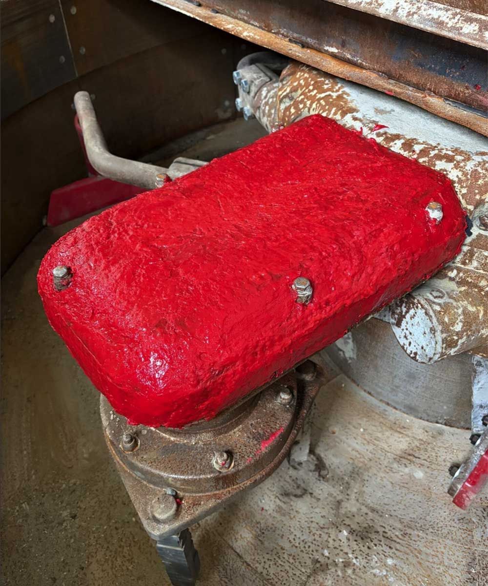 Der große Vorteil hierbei ist, dass man den Verschleiß künftig sofort erkennen kann, wenn das Lochblech unter der Spachtelmasse zum Vorschein kommt und man einfach nach kurzem Anrauen wieder überspachteln kann. Somit sind Standzeiten, Verschleiß und Kosten gesenkt worden.